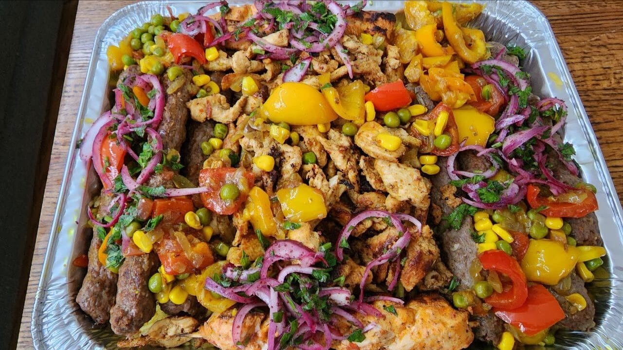 Syriana rice cooked with vegetables topped with 2 shish tawooks, 2 chicken thighs, and 2 beef kebabs. Comes with a full salad of your choice, hummus with pita, and 2 canned drinks.