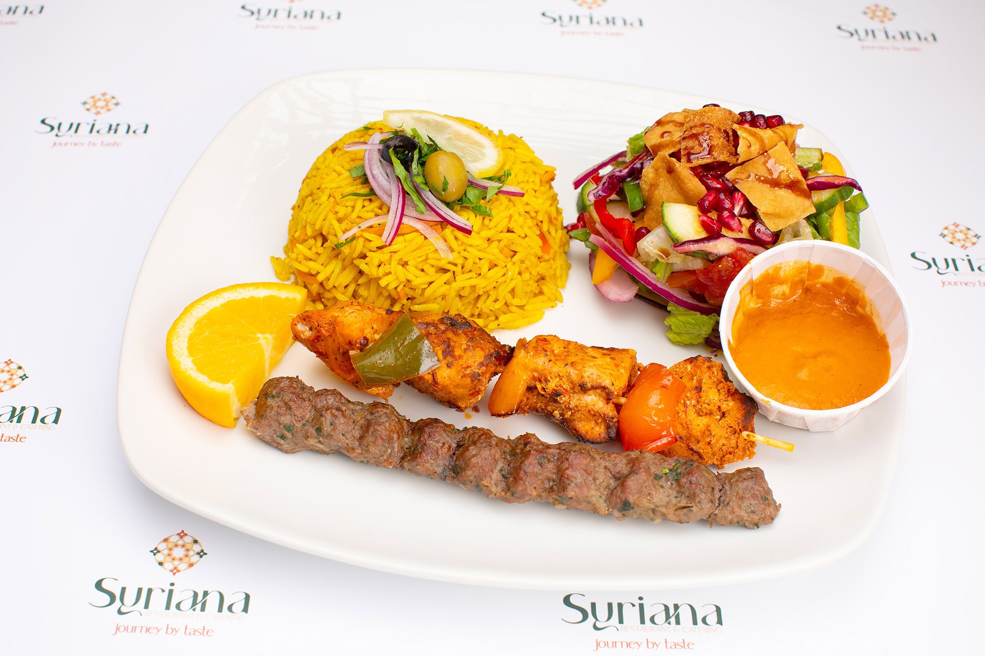 Syriana rice cooked with vegetables and your choice of 2 bbq skewers (shish tawook, chicken kebab, chicken thigh, or beef kebab) with a salad of your choice, and canned drink.